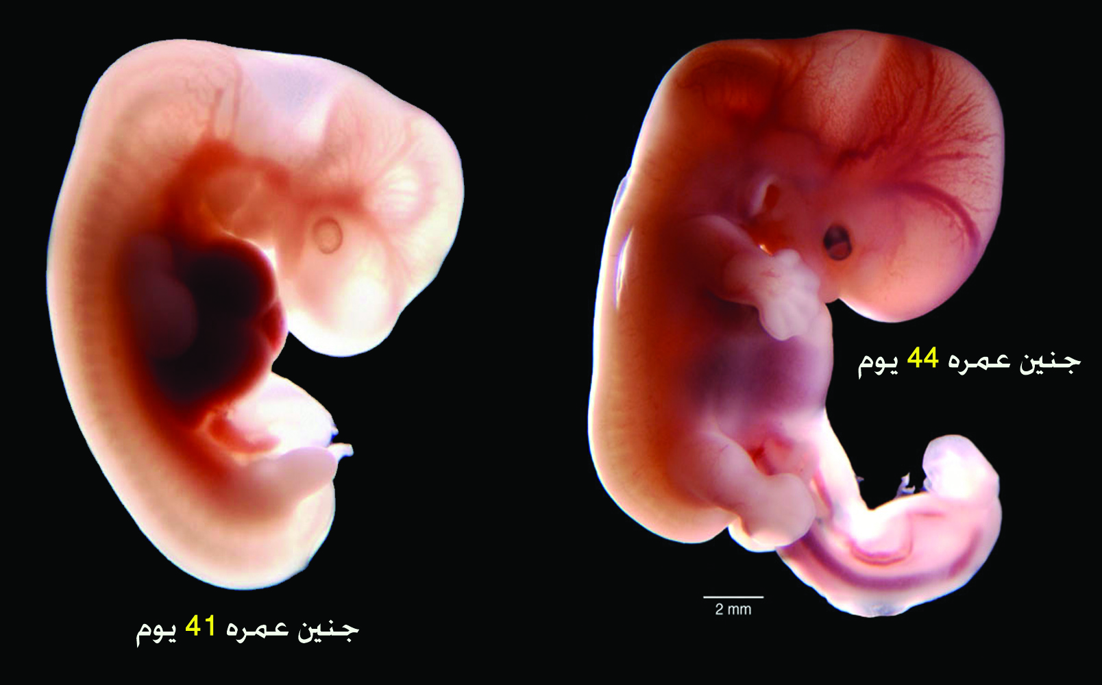 صورة حقيقية لجنين: على اليسار عمر الجنين 41 يوماً، وعلى اليمين أصبح عمره 44 يوماً.. انظروا كيف تم خلق الأطراف وإعطاء صورة الوجه والعينين والأذنين... سبحان الله!